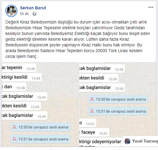 Paylaşımını WhatsApp yazışmalarıyla da destekleyen Barut, Kiraz Belediyesi'nin içinde bulunduğu durumu "içler acısı" olarak yorumlarken; Hisar Tepesi restoranın elektrik dağıtım şirketi tarafından önce saatten kesildiğini, daha sonra kaçak elektrik alındığını, devamında elektiriğin direkten kesildiğini duyuruyor...