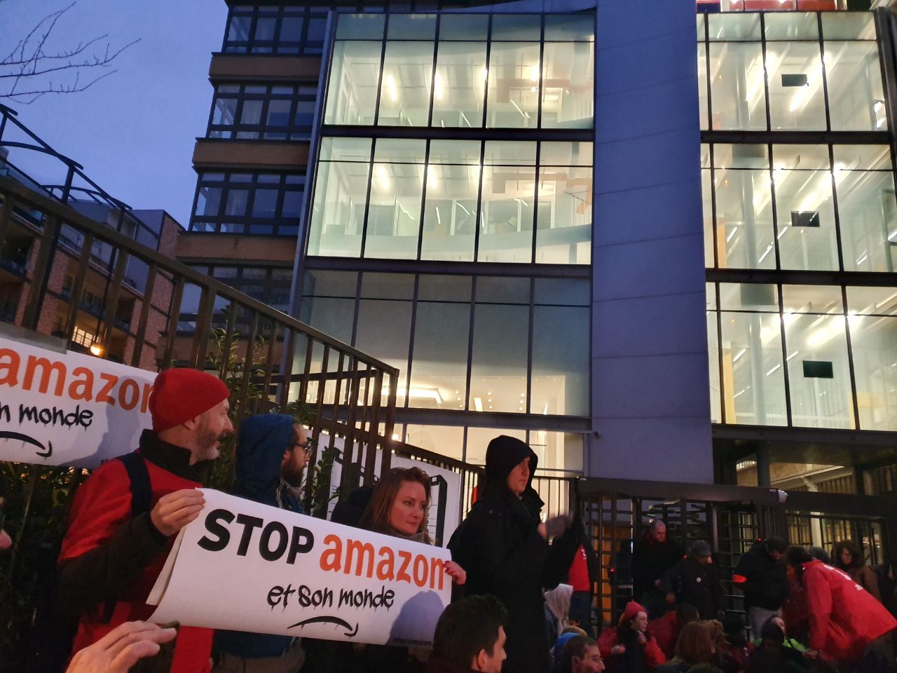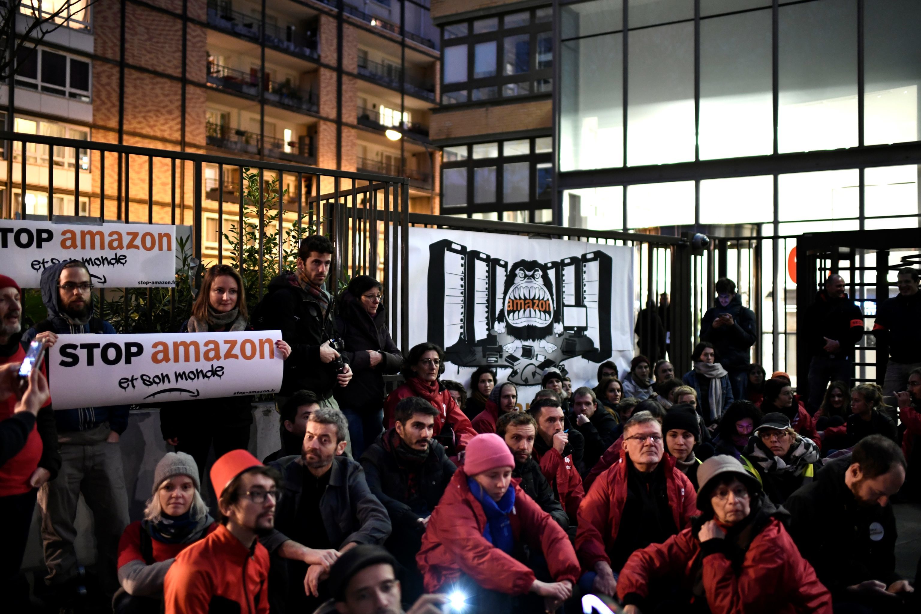 Başkent Paris’in Clichy bölgesinde Amazon’a ait merkezin önünde sabahın ilk ışıklarıyla toplanan protestocular, 'Amazon’a ve onun dünyasına hayır' yazılı pankart açtı.