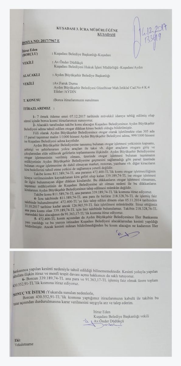 Edinilen bilgiye göre, Büyükşehir yasasının oluşmasının ardından Aydın Büyükşehir Belediyesi ile Kuşadası Belediyesi arasında gerçekleştirilen devir işlemleri kapsamında Kuşadası Belediyesi’nin Aydın Büyükşehir Belediyesi adına Kuşadası Otogarı’ndan 811 bin 589 lira dükkan kirası tahsilatı yaptığı belirlenmişti. Kuşadası Belediyesi, Aydın Büyükşehir Belediyesi adına otogar dükkan kirası tahsilatı yaptığını 30 Eylül 2014 tarihinde resmi yazı ile Aydın Büyükşehir Belediyesi’ne bildirmiş ve ardından da bu bedelin yazışmalara rağmen ödenmemesi üzerine 12 Ekim 2017 tarihinde de hukuki işlem başlatmıştı. Aydın Büyükşehir Belediyesi’nin başlattığı hukuki işlem üzerine Kuşadası Belediyesi Hukuk İşleri tarafından Kuşadası 3. İcra Dairesi’ne itirazda bulunuldu. Kuşadası Belediyesi’nin itirazında otogar alanının mülkiyetinin bir bölümünün tapusunun Kuşadası Belediyesi’ne ait olduğu belirtilerek, devir işleminin ardından Aydın Büyükşehir Belediyesi tarafından işletilmeye başlanan otogar içerisindeki dükkan ve benzeri yerlerin işletme kapsamında olmadığı, büyükşehir belediyesinin işletmesinin sadece otogar faaliyetlerini kapsadığı ileri sürülmüştü. Kuşadası Belediyesi’nin itirazını görüşen Kuşadası 3. İcra Dairesi, takibe konu borcun ana parası olan 811 bin 589 liranın 339 bin 189 lirasına yapılan itirazı kabul etti. İtirazın ardından Aydın Büyükşehir Belediyesi’nin Kuşadası Belediyesi’nden alacağı 472 bin 400 lira olarak kesinleşti. Alacağın kesinleşmesinin ardından Aydın Büyükşehir Belediyesi 1. Hukuk Müşavirliği tarafından Kuşadası Belediyesi’ne yönelik icra işlemleri yeniden başlatıldı. Aydın Büyükşehir Belediyesi faizleriyle birlikte 750 bin lirayı bulan alacağının tahsili için aralarında Kuşadası’nın simgesi tarihi Güvercinada Kalesi’nin de bulunduğu tüm mülkler ile Kuşadası Belediyesi’nin İller Bankası’ndan olan alacaklarına haciz koydurdu.