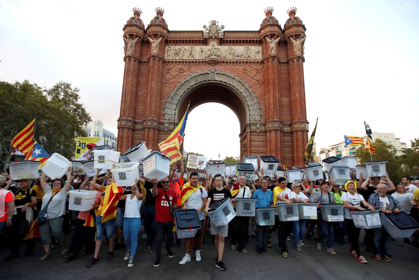 “Siyasi tutuklular için özgürlük”, “1 Ekim’i unutma” sloganları atan göstericiler, bir yıl önceki referandumda kullanılan oy sandıkları ve hapishanedeki Katalan politikacıların posterlerini taşıdı.