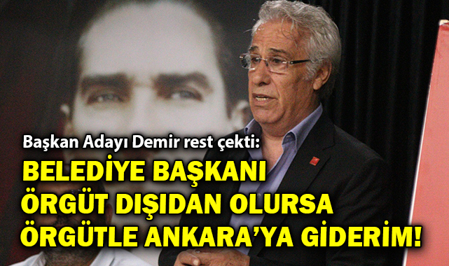 Seçilmesi durumunda örgüte sahip çıkacağını belirten Demir, "Tam uyum içerisinde çalışacağız. Asla kavga etmeyeceğiz. Bizim kavgamız yoldaşlarımıza karşı değil. Bizim mücadelemiz bu düzene karşı olacak. Bu seçimde kaybeden olmayacak. Sizlerle kucaklaşarak çıkacağız eğer ayrışırsak o zaman hepimiz kaybederiz. Kişiler gelip geçicidir. Asıl olan CHP’dir. 46 yıldır ben bu partiye emek veriyorum. Bu partinin üyesiyim çok kademelerde görev aldım. Hiçbir zaman CHP’ye küsmedim. Hiçbir dönem bir arkadaşımız yolda bırakmadım. CHP’nin değerlerini ok iyi biliyorum. Bu 46 yıl içinde bu örgüte benim borcum var. İlçe başkanlığına gururla onurla taşıdım. Kimsenin emrine vermedim o koltuğu. Ön seçim yapmak genel merkezin işi. Önümüzdeki seçimlerde belediye seçimlerinde eğer bir tane meclis üyesi bu örgütün dışında gelirse Bayraklı’ya ben görevden istifa edeceğim. Söz veriyorum; Mevcut belediye başkanımız görevine devam ettiği sürece başımızın üzerinde yeri var. Mevcut belediye başkanımızın dışında Bayraklı Belediye Başkanlığı gelecekse bu örgütün içerisinden gelecek dışardan belediye başkanı istemiyorum beni görevden alsınlar, almasalar ben istifa ederim. Bütün örgütü toplar, Ankara’ya kadar yola çıkarım. Ben seçildiğim takdirde bu 5 ayda yönettiğim şekil belli. Kapıda karşılarım, kapıda uğurlarım. O koltuğa oturmam o koltuk hepimizin. O koltuk Mustafa Kemal’in 3’üncü koltuğudur. O koltuğu namusuma sahip çıktığım gibi çıkarım. Cumhuriyet değerlerimizi birer birer yok ediyorlar. CHP bu cumhuriyetin ulu çınardır. Bu çınar ekilirken CHP bize emanet edilirken şehitlerimiz kanıyla sulandı. Mustafa Kemal’in alın teriyle kuruldu bu parti. Bu partiyi ne faşizan yapıya ne de bu partinin içinde ayak oyunlarıyla partiyi dağıtmaya çalışanlara teslim etmeyeceğiz. Eğer bu partiye ihanet edersen ne o şehitlerimiz kanı bize helal olur, ne de Mustafa Kemal Atatürk’ün alın teri bize helal olur. Onun için partimize sahip çıkacağız. Hiç kimseyi kimseden ötekileştirmeyeceğiz. Benim dünya görüşüm bu. Bu partiye zarar veren benim öz kardeşimde olsa, düşmanımdır. Ezer geçerim! Benim kulağımın arkasında hiçbir hesap yok. Hiçbir mahallede elimde kalem kağıt yoktu. Hesap vereceğim kimse yok. Sadece size veririm. Kimseye de eyvallahım yoktur. Bu örgüt neye karar verirse başımın üzerinde yeri var" ifadelerini kullandı.