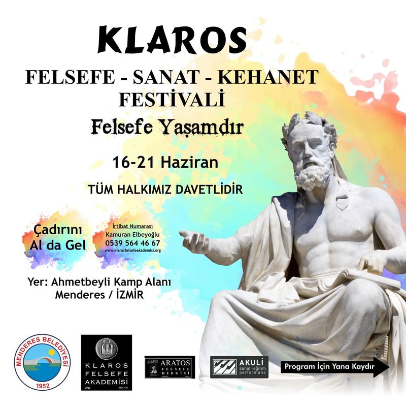 Menderes 16-21 Haziran tarihlerinde ise felsefe dolu bir festivale şahitlik edecek. 16 Haziran Perşembe Saat 11.00’de Klaros Antik Kenti’nde başlayacak festival, 3 gün boyunca Ahmetbeyli kamp alanında devam edecek. 17-21 Haziran’da Ahmetbeyli kamp alanına çadırlarıyla gelen felsefe severler, 37 kişilik uzman araştırmacı eğitmenler ve akademisyenlerden oluşan ekiple interaktif ve bilgilendirici sunumlara şahitlik edecekler. Çocuklara felsefe atölyesinden, sergilere; doğa yürüyüşlerinden, yoga etkinliğine birbirinden farklı etkinliklerin yer alacağı festivalde, katılımcılar sahne performanslarıyla da eğlenceli vakit geçirecekler.