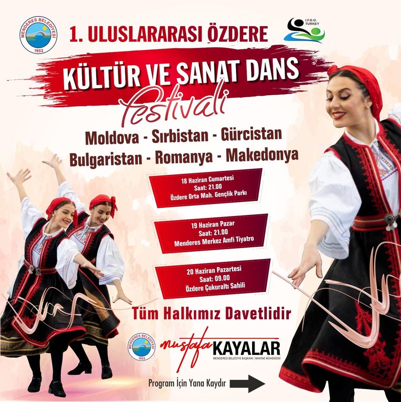Menderes Belediyesi, 17 Haziran’da da 6 farklı ülkeden gelen dans topluluklarını ilçede misafir edecek. Moldova, Sırbistan, Gürcistan, Bulgaristan, Romanya ve Makedonya’dan yüzlerce dansçının katılacağı festivalde, dansçılar ülkelerine özgü dansları sergilerken, Menderes Belediyesi Halk Dansları Topluluğu da zeybek gösterisiyle festivale renk katacak.