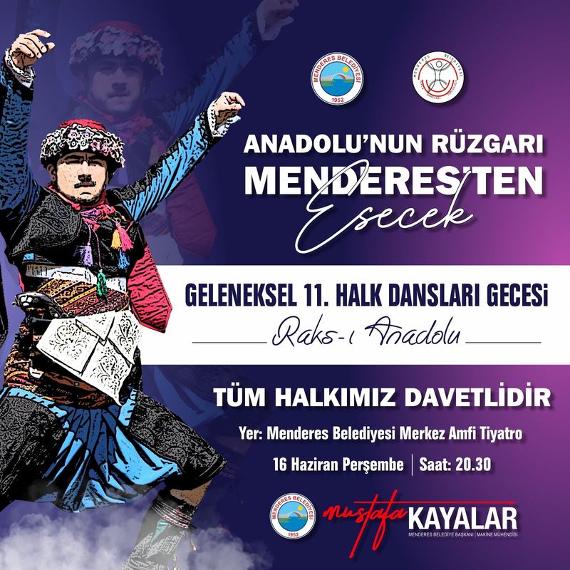 Menderes Belediyesi Halk Dansları Topluluğu “11. Raks-ı Anadolu” gösterisiyle sanatseverlere kültür mozağinin yaşanacağı bir gece yaşatacak. 9 farklı gösterinin yer alacağı gecede 200 kişilik ekip bir yıl boyunca hazırladıkları, Anadolu’nun farklı yörelerinden keyifli koreografileri sahneleyecek. Etkinlik, 16 Haziran Perşembe Günü Saat 20.30’da Menderes Belediyesi Merkez Amfi Tiyatroda ücretsiz şekilde gerçekleşecek.