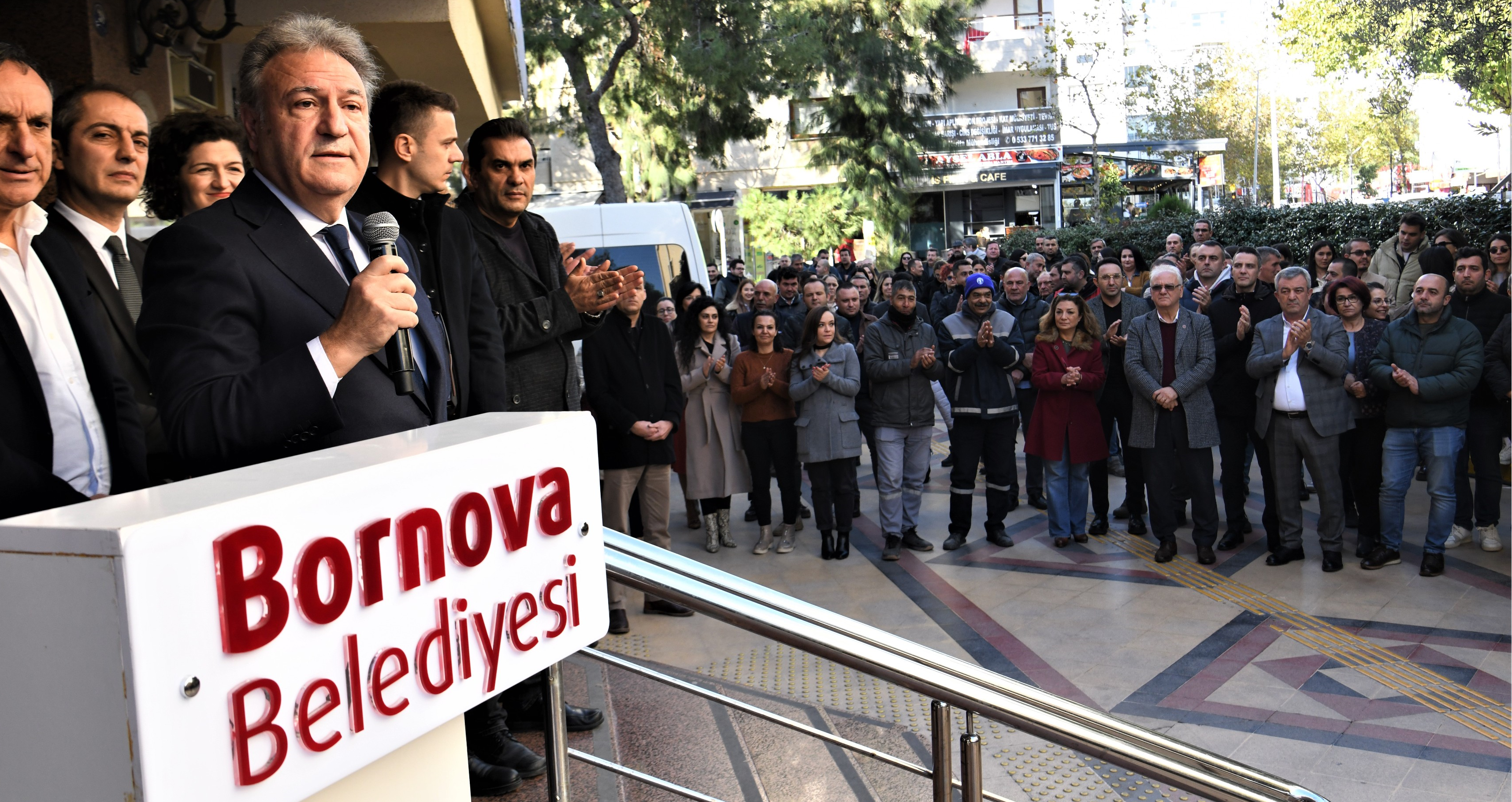 Bornova Belediye Başkanı Dr. Mustafa İduğ, hizmet binası önünde yaptığı açıklamada 2019 yılının 8 Nisan günü daha önce başlamış olan grevi sonlandırdıkları günden bu yana sendika ile aralarından tam bir uzlaşı olduğunu belirterek, “Bu uzlaşının temeli insan odaklı çalışma anlayışımız. Biz insan odaklı çalışma anlayışımızı bugünlere de taşıdık. İşçilerimize vereceğimiz promosyon rakamının belirlenmesinde emeği geçen herkese teşekkür ediyorum” dedi. Türkiye’de satın alma gücünün giderek düştüğünün altını çizen Başkan İduğ, “İki sene önce 100 liraya aldığımız bir şeyi şimdi 1000 liraya alamıyoruz. Promosyon için ihale açtık. Bankalyar bize geldi, en çok verilen para 13 bin liraydı. Faizler yüzde 30-40 seviyesinde iken promosyon olarak verilen paranın 13 bin lira olmasına gönlümüz razı gelmedi. İhaleyi iptal ettik ve süreci takip ettik. Bunun üzerine Türk Ekonomi Bankası ile 20 bin 500 lira tutarındaki promosyon tutarı üzerinde anlaşma sağladık. Bereketli olsun” diye konuştu.