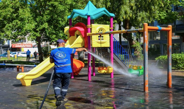Buca’nın 47 mahallesinin tümünde gerçekleştirilecek çalışmalar kapsamında, parklarda bulunan çocuk oyuncakları, kent mobilyaları ve spor aletleri baştan aşağı elden geçirilerek bakım ve tamirleri yapılıyor. Hava sıcaklıklarının artması ile koku oluşumunun önüne geçmek amacıyla çevrede bulunan çöp konteynerleri yıkanıp, dezenfekte edilerek ilaçlanıyor. Yeşil alanlarda ise yabani otlar temizlenip çimler kesiliyor. Çıplak alanlarda çimlendirme işlemi yapılarak mevsimine uygun çiçek dikiliyor. Kırılmış veya kurumuş ağaç dalları kesilerek olası bir tehlikenin önüne geçiliyor. Çocukların daha temiz ortamda vakit geçirmesini sağlamak amacıyla tazyikli su ile yürüyüş yolları ve oyun parkları yıkanıyor.