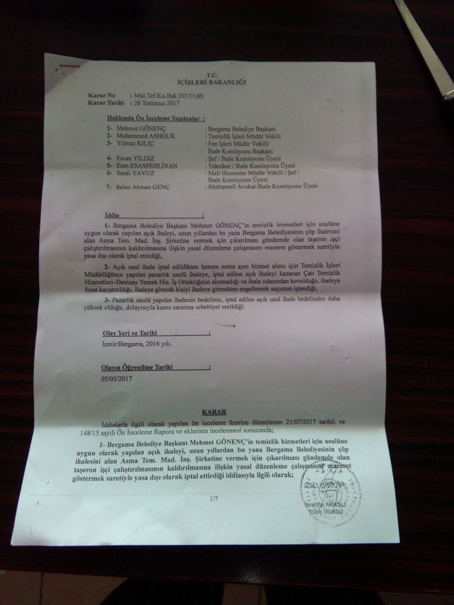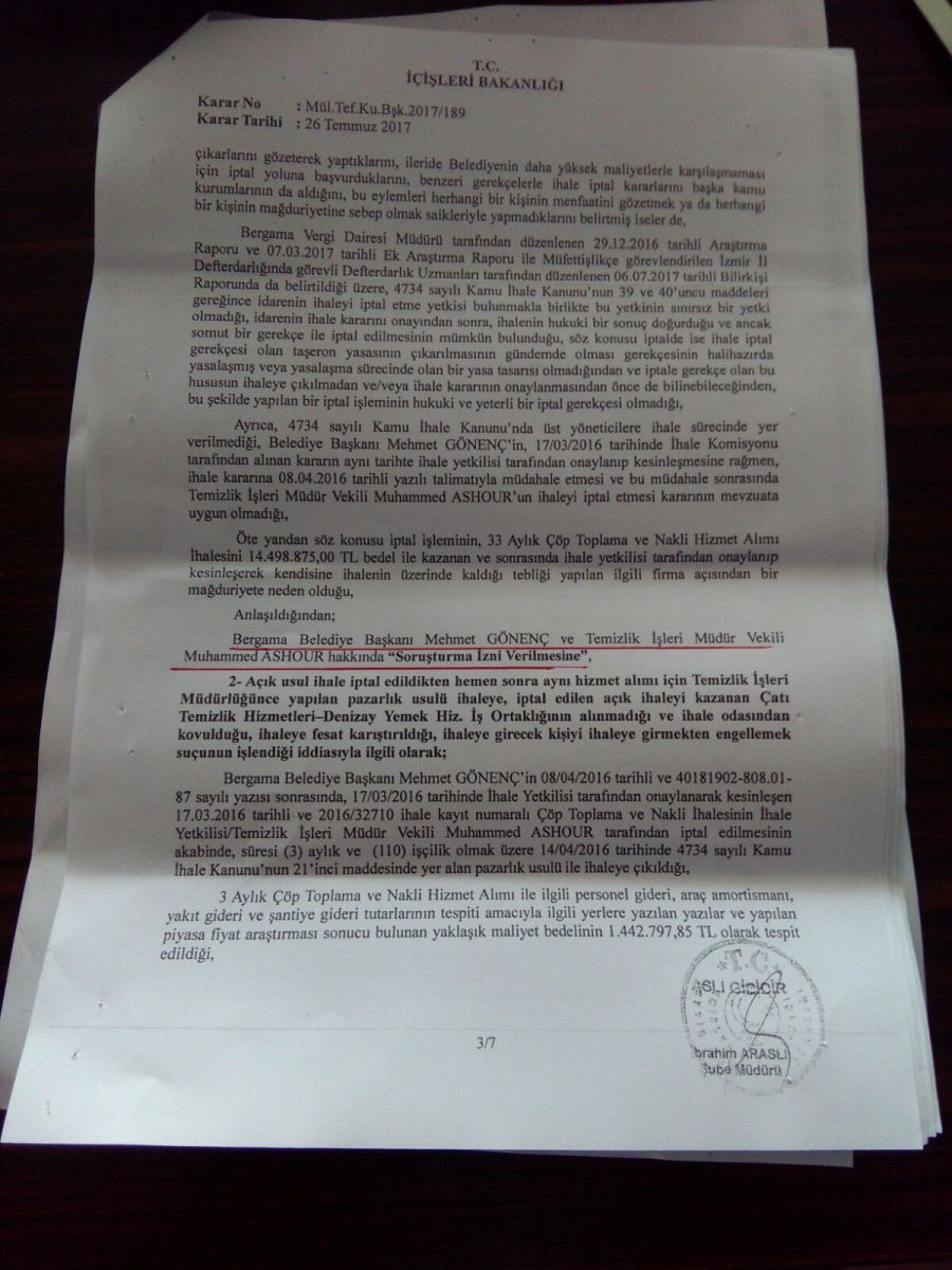 Yapılan denetim sonucunda düzenlenen ön inceleme raporunda, "Söz konusu iptalde ihale iptal gerekçesi olan taşeron yasasının çıkarılmasının gündemde olması gerekçesinin halihazırda yasalaşmış veya yasalaşma sürecinde olan bir yasa tasarası olmadığından ve iptale gerekçe olan bu hususun ihaleye çıkılmadan ve/veya ihale kararının onaylanmasından önce de bilinebileceğinden, bu şekilde yapılan bir iptal işleminin hukuki ve yeterli bir iptal gerekçesi olmadığı, ayrıca 4734 sayılı Kamu İhale Kanunu'nda üst yöneticilere ihale sürecinde yer verilmediği, Belediye Başkanı Mehmet Gönenç'in, 17/03/2016 tarihinde İhale Komisyony tarafından alınan kararın aynı tarihte ihale yetkilisi tarafından onaylanıp kesinleşmesine rağmen ihale kararına .8.04.2016 tarihli yazılı talimatıyla müdahale etmesi ve bu müdahale sonrasında Temizlik İşleri Müdür Vekili Muhammed Ashour'un ihaleyi iptal etmesi kararının mevzuaata uygun olmadığı, öte yandan söz konusu iptla işleminin, 33 Aylık Çöp Toplama ve Nakli Hizmet Alımı İhalesini 14.498.875,00 TL bedel ile kazanan ve sonrasında ihale yetkilsi tarafından onaylanıp kesinleşerek kendisine ihalenin üzerinde kaldığı tebliği yapılan ilgili firma açısından bir mağduriyete neden olduğu anlaşıldığından Bergama Belediye Başkanı Mehmet Gönenç ve Temizlik İşleri Müdür Vekili Muhammed Ashour hakkında 'soruşturma izni verilmesine' 4483 Sayılı Memurlar ve Diğer Kamu Görevlilerinin Yargılanması Hakkında Kanun'un 6. maddesi uyarınca, tebliğ tarihinden itibaren 10 gün içinde Danıştay Birinci Dairesine itiraz yolu açık olmak üzere, 26.07.2017 tarihinde karar verildi." denilerek, konuyla ilgili yasal süreç başlatıldı.