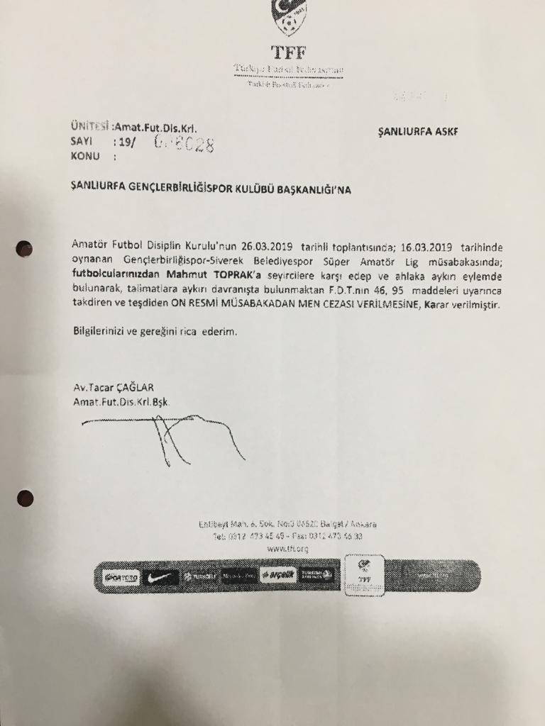 Maçın sonunda Siverek Belediyespor 1 puan farkla şampiyon oldu. Taraftarlar, Şanlıurfa Gençlerbirliği'nin 5 numaralı futbolcusu Mahmut Onur Toprak’a tepki gösterince, Toprak da saha içinde Siverek taraftarının bulunduğu tribüne yönelerek şortunu indirip cinsel organını gösterdi. Cep telefonuyla kaydedilen görüntüler üzerine Amatör Spor Kulüpleri Federasyonu inceleme başlattı. Görüntüleri inceleyen disiplin kurulu Mahmut Onur Toprak’a 10 resmi müsabakadan men cezası verdi.