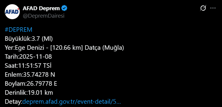 Muğla’nın Datça ilçesi açıklarında 3.7 büyüklüğünde deprem meydana geldi. AFAD verilerine göre deprem Ege Denizi’nde, yerin 19 kilometre derinliğinde kaydedildi
