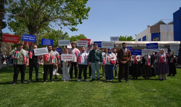 Grup adına açıklama yapan öğrencilerden Kadir Gülhan, İsrail'in yayılmacılığının 7 Ekim 2023 itibariyle insanlığın utanç tablosu olarak değerlendireceği bir soykırım halini aldığını söyledi.