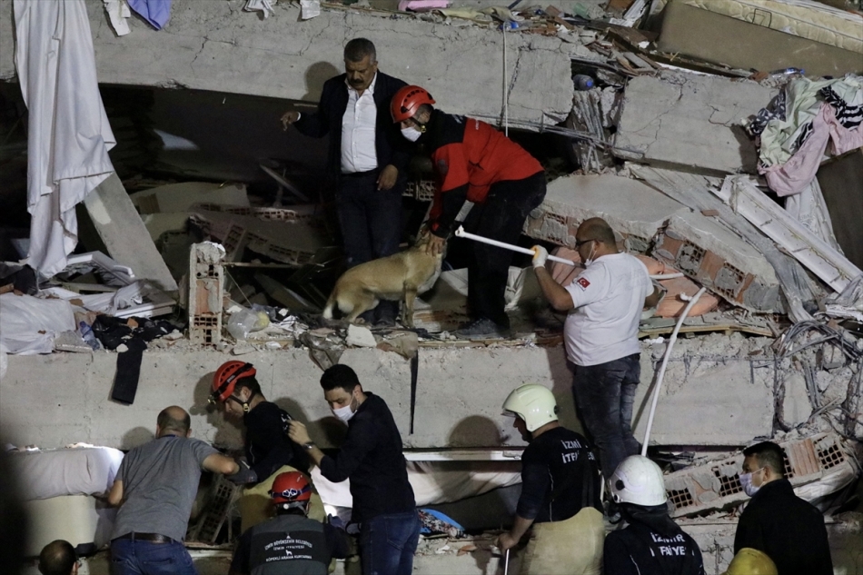 Merkez üssü Ege Denizi'nin Seferihisar açıkları olan 6,6 büyüklüğünde deprem meydana geldi. Deprem sonrası İzmir'in Bayraklı ilçesinde yıkılan bir binada arama ve kurtarma çalışması devam ediyor. Fotoğraflar: AA-İHA