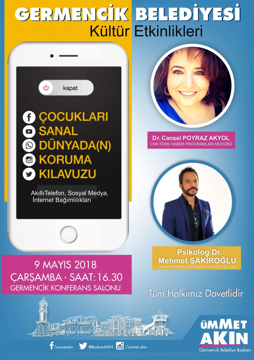 Germencik Belediyesi Kültür Sosyal İşler Müdürlüğü tarafından düzenlenen kültür etkinlikleri kapsamında “Çocukları Sosyal Medyada(n) Koruma Kılavuzu” konferansı ile Psikolog Dr. Mehmet Şakiroğlu Germenciklilerle buluşacak.