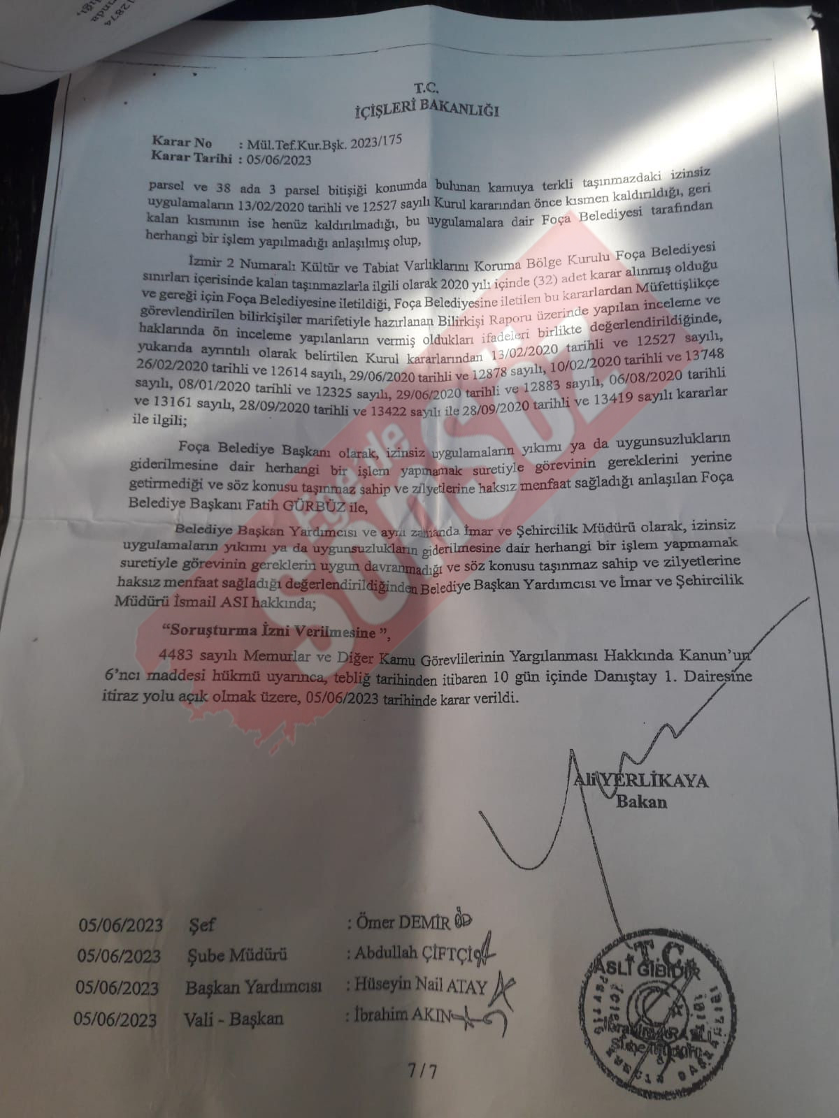 İçişleri Bakanı Ali Yerlikaya, Foça Belediye Başkanı Fatih Gürbüz ve eski belediye başkan yardımcısı İsmail Ası hakkında görevi kötüye kullanma ve Kültür ve Tabiat Varlıklarını Koruma Bölge Kurulu’nun aldığı yıkım kararlarını yerine getirmeme iddialarından soruşturma açılmasına izin verdiği ortaya çıktı.