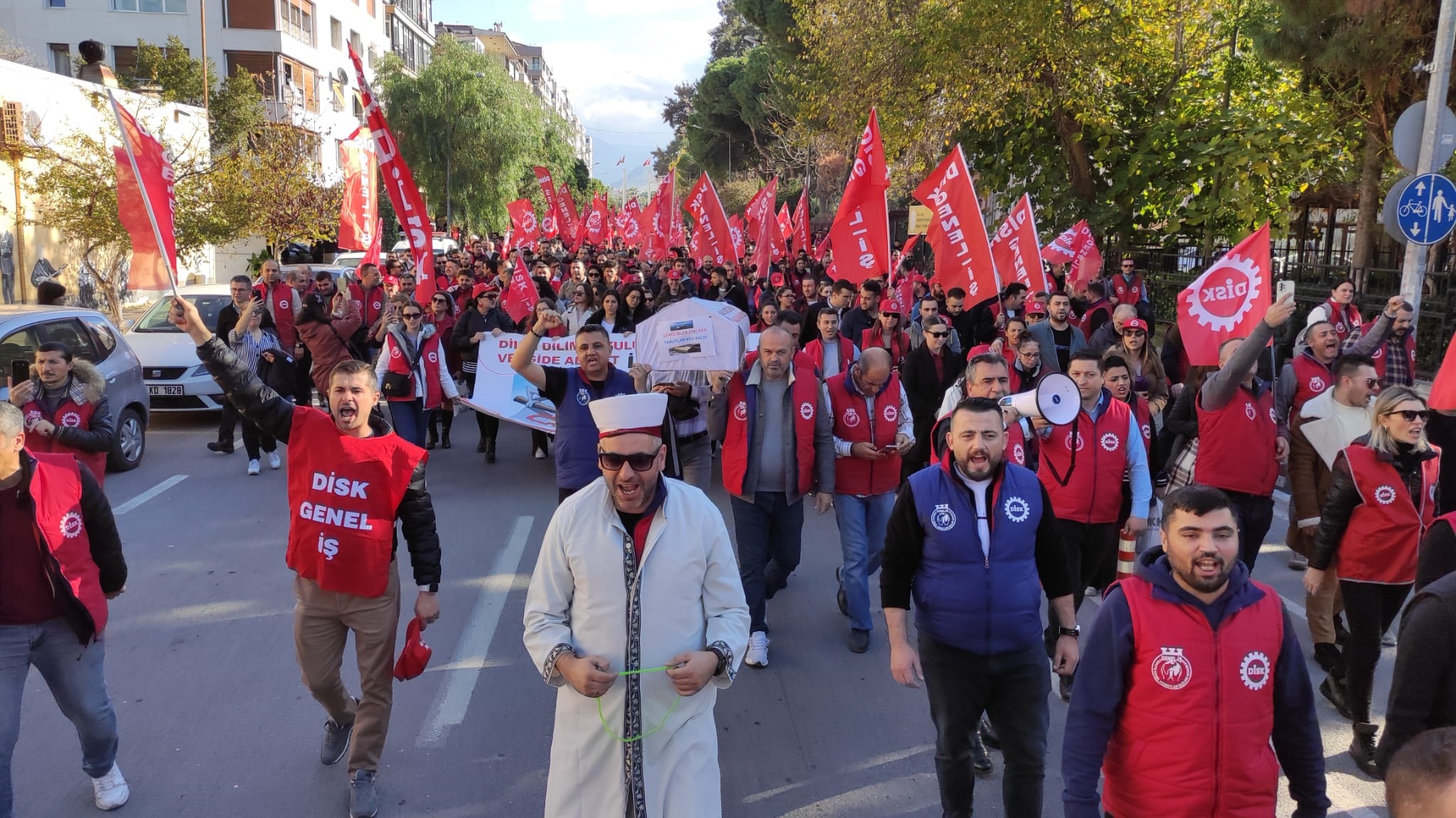 Cumhurbaşkanı Recep Tayyip Erdoğan’ın 2024 yılında ara zam yapılmayacağını açıkladı asgari ücret ile ilgili Türkiye Devrimci İşçi Sendikaları Konfederasyonu (DİSK) İzmir’de sahaya indi. DİSK Genel Başkanı Arzu Çerkezoğlu’nun da katıldığı yürüyüş Basmane Meydanı’ndan start alırken, yarım günlük iş bırakan sendika üyeleri Cumhuriyet Meydanı’na yürüdü. Yürüyüşe İzmir Büyükşehir Belediye Başkanı Tunç Soyer, Konak Belediye Başkanı ve İzBB Başkan Aday Adayı Abdül Batur en ön sıralardan eşlik etti.