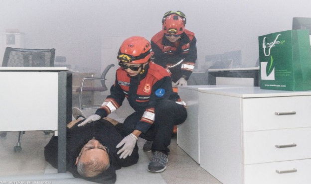 İzmir Büyükşehir Belediyesi İnsan Kaynakları ve Eğitim Dairesi Başkanlığı İş Sağlığı ve Güvenliği Şube Müdürlüğü ile İtfaiye Dairesi Başkanlığı Kültürpark’taki hizmet birimlerinde yangın tatbikatı düzenledi. Birimlerde çalışan yaklaşık 3 bin personel olası yangın ve deprem gibi acil durumlarda, neler yapılması gerektiği konusunda bilinçlendirildi. Tatbikat, sirenlerin çalmasıyla başladı. Sis makineleriyle yapay duman üretilen binada personel güvenli bir şekilde dışarı çıkarıldı. Engelli, hamile veya kronik rahatsızlığı olan risk grubundaki çalışanlar da acil durumlar için önceden belirlenmiş refakatçileri eşliğinde binayı terk etti. Çalışanlar, alana çekilen güvenlik şeridinin arkasına alındı. Senaryo gereği dumandan etkilenen bazı çalışanlar, İtfaiye Dairesi Başkanlığı’na bağlı paramedikler tarafından sedyeyle çıkarılarak, 112 Acil Kurtarma Sağlık (AKS) ambulansına bindirildi. Merdivenli bir itfaiye aracı da çatıdaki yangına müdahale anını canlandırdı. Tatbikat, itfaiye ekiplerinin senaryo gereği yangına müdahalesiyle sona erdi.