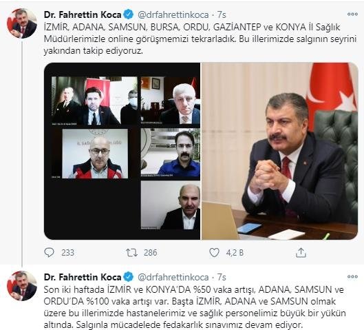 Bakan Koca toplantı sonrası Twitter üzerinden yaptığı açıklamada, "İzmir, Adana, Samsun, Bursa, Ordu, Gaziantep ve Konya İl Sağlık Müdürlerimizle online görüşmemizi tekrarladık. Bu illerimizde salgının seyrini yakından takip ediyoruz" dedi.