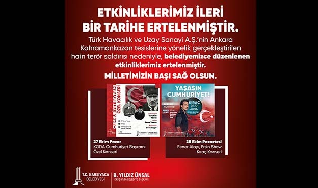 Karşıyaka Belediyesi, Ankara’da meydana gelen hain terör saldırısı nedeniyle, Cumhuriyet Bayramı kutlamaları kapsamındaki eğlence programı ve törenleri erteleme kararı aldı.