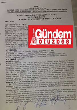 Tuncay ve iki arkadaşının İzmir Karşıyaka Cumhuriyet Başsavcılığına verdikleri dilekçede; YSK Başkanı Güven ve Asil ve Yedek üyelerinin Yargıtay tarafından yargılanmaları için dava açılması isteniliyor.