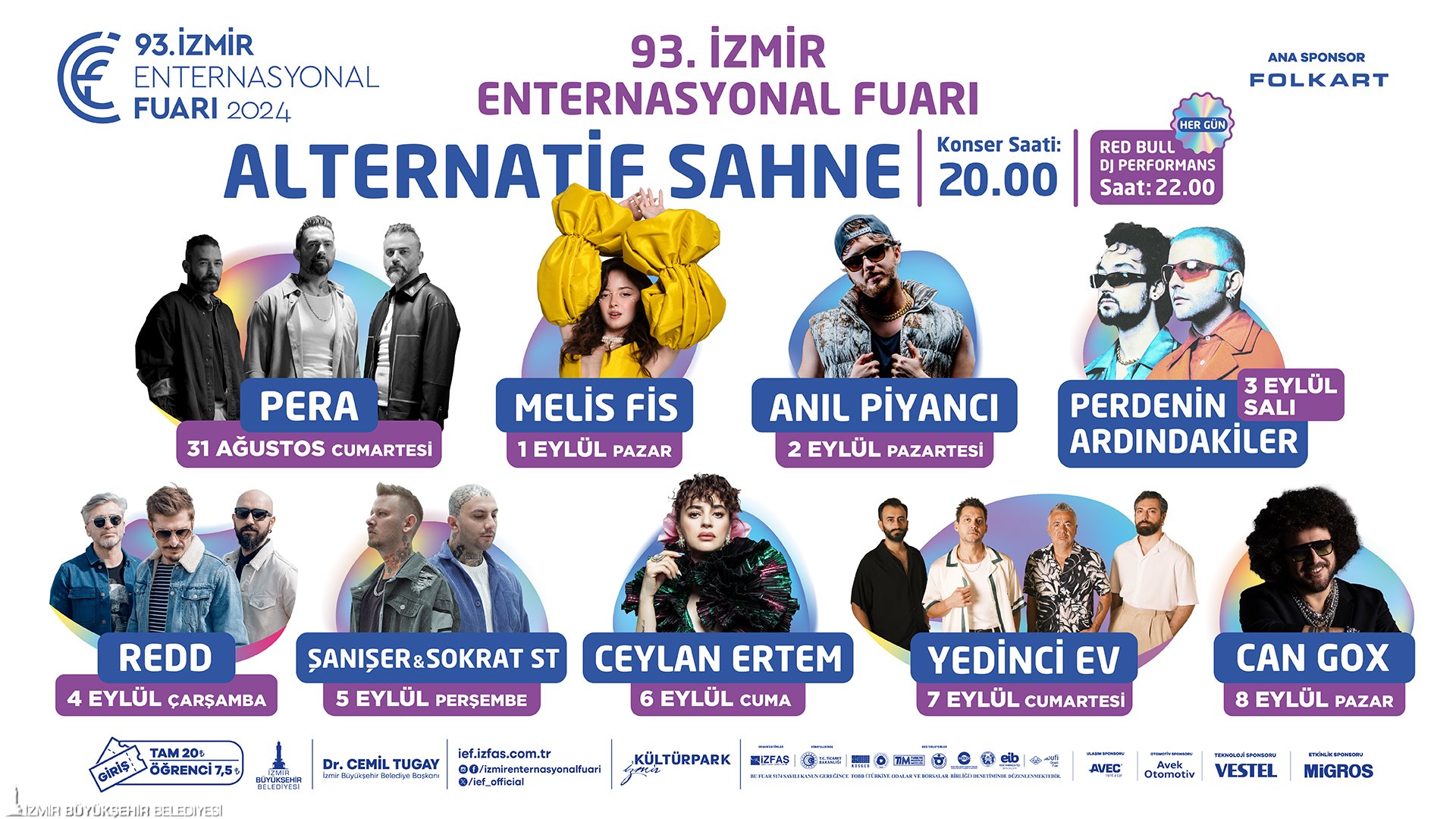 Ziyaretçiler, Fuar akşamlarında keyif dolu anlar yaşamak için her yıl olduğu gibi bu yıl da Fuar konserlerinde buluşacak. Çim Konserleri’nin ilki, Fuar’ın ilk günü olan 30 Ağustos Zafer Bayramı’nda Mert Demir ile başlayacak. Sırasıyla Teoman, Volkan Konak, Hande Yener, Semicenk, Motive, Mahsun Kırmızıgül, Hayko Cepkin ile Migros sponsorluğunda Derya Bedavacı ve Sakiler sahne alacak. Coşku, 9 Eylül’de İzmir’in kurtuluşunun 102. yılında Haluk Levent konseriyle zirveye çıkacak. Alternatif Sahne’de ise konserler 31 Ağustos'ta başlayacak. İlk akşam Pera, sonrasında ise Melis Fis, Anıl Piyancı, Perdenin Ardındakiler, Redd, Şanışer&Sokrat St, Ceylan Ertem, Yedinci Ev ve Can Gox sahne alacak.