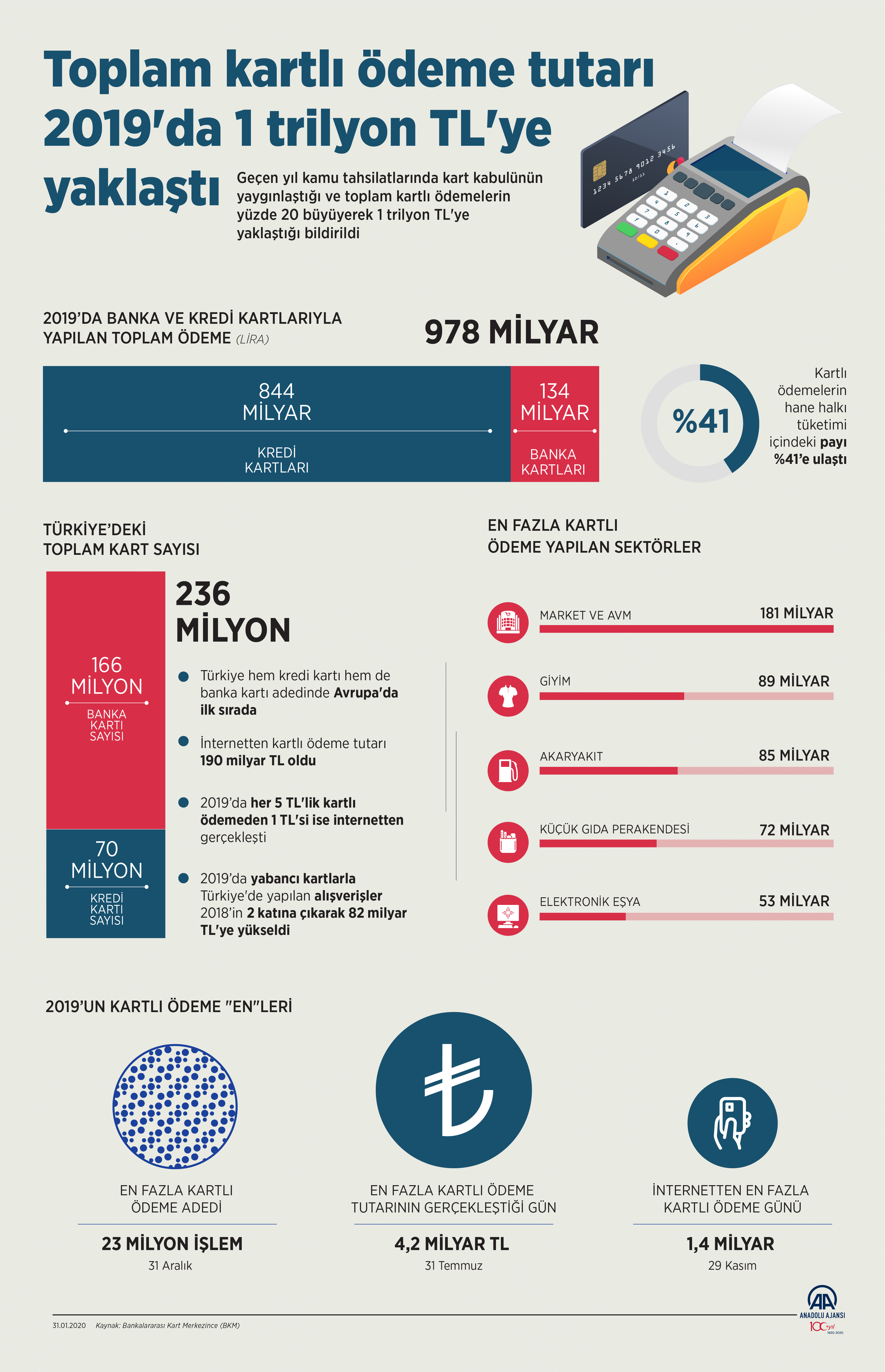 Bankalararası Kart Merkezince (BKM) geçen yıl kamu tahsilatlarında kart kabulünün yaygınlaştığı ve toplam kartlı ödemelerin yüzde 20 büyüyerek 1 trilyon TL'ye yaklaştığı bildirildi. Kredi kartı sayısı, yeni kullanıcılarla birlikte, 2019 yılında bir önceki yıla kıyasla yüzde 5 artışla yaklaşık 70 milyona ulaşırken, banka kartı sayısı ise yüzde 14 artışla 166 milyona çıktı.