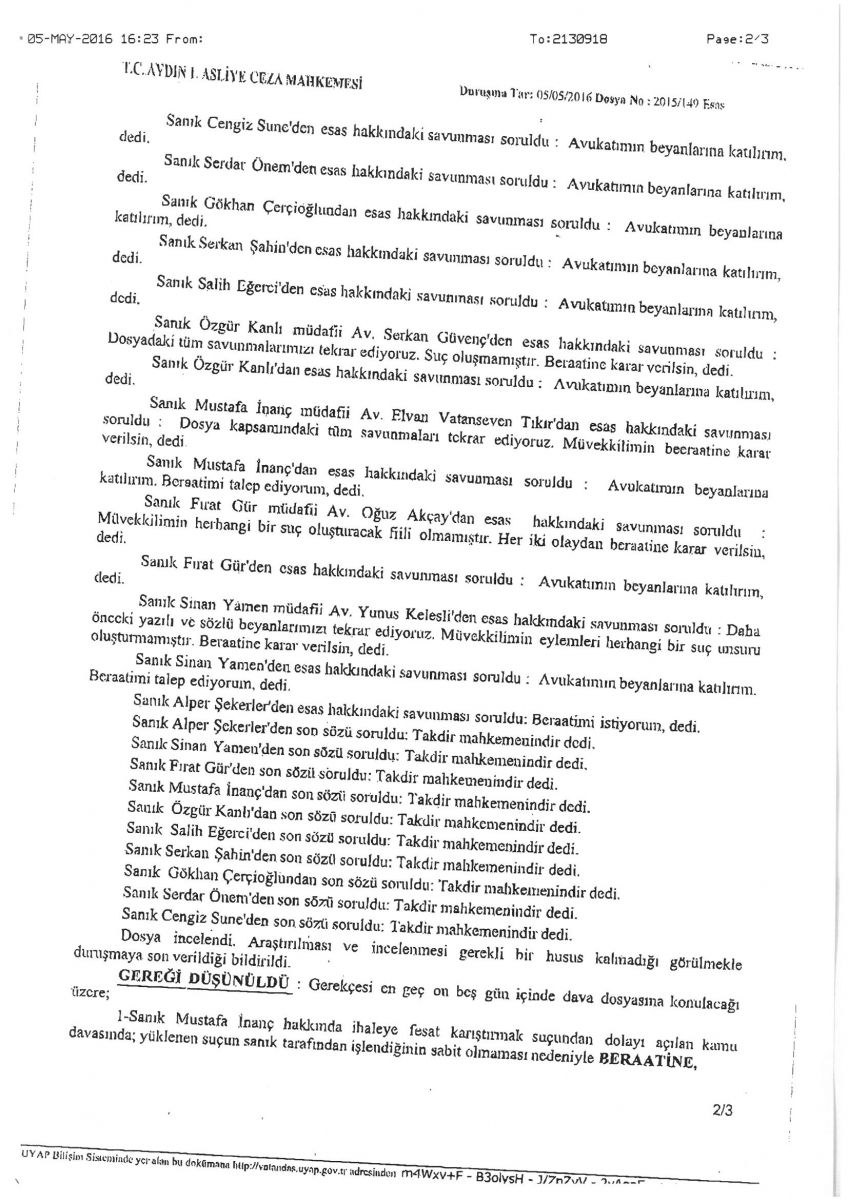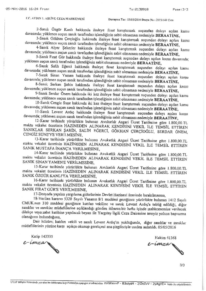 Aydın Belediyesi tarafından yapılan Atatürk Kent Meydanı ile ilgili 2015 yılında ihaleye fesat karıştırma iddiası ile açılan dava sonuçlandı. Aydın 1. Asliye Ceza Mahkemesi, içinde Aydın Büyükşehir Belediyesi personelinin de bulunduğu 10 kişiye esastan beraat vererek, herhangi bir suç işlenmediği kararını verdi.